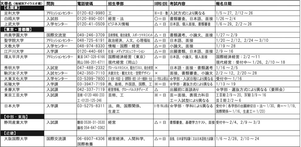 私立大学 ( 本科 )2026 留学生招生日期一览表
